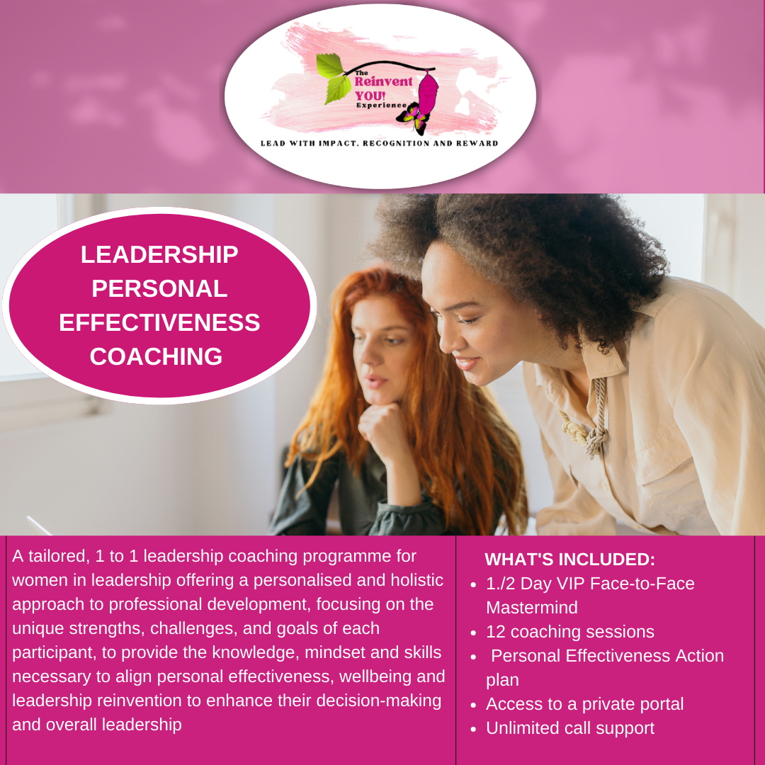 This investment includes all one-on-one coaching sessions, assessments, personalized action plans, ongoing support, and access to additional resources throughout the duration of the programme. The Reinvent YOU Personal Effectiveness 1-to-1 Coaching Programme offers a unique and tailored approach to personal and professional development, empowering women leaders to achieve their highest potential and drive meaningful impact in their careers and lives.