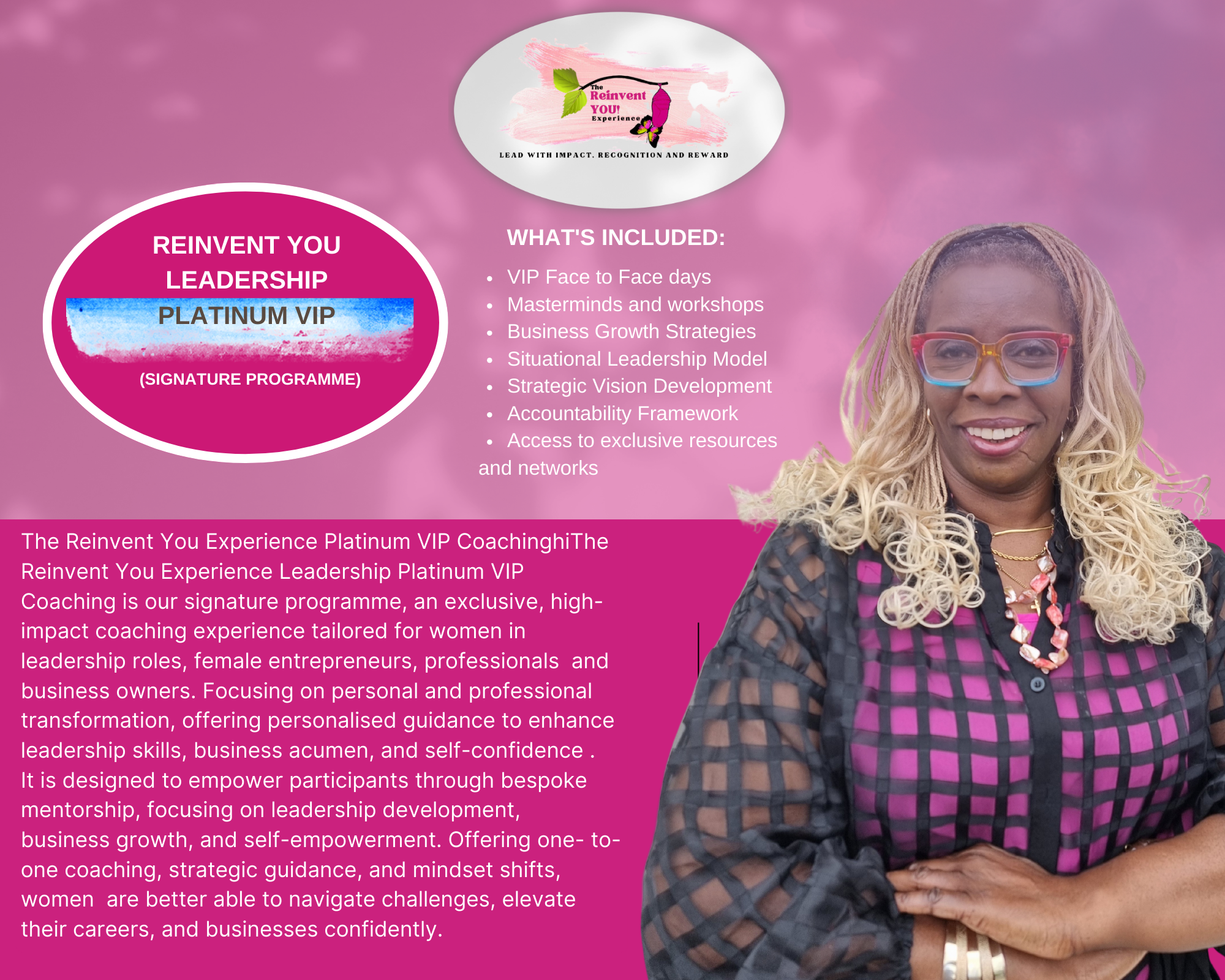 Personalised Coaching Sessions: 3 1-hour sessions over 6 weeks months, focusing on essential leadership development, communication skills, confidence building, personal branding and strategic career planning.